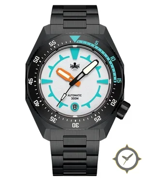 A Dive watch with a versatile 39.5mm case, that suits most wrists, crafted from stainless steel featuring a white dial with a unique grained/textured (sandpaper-like) finish.