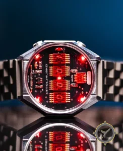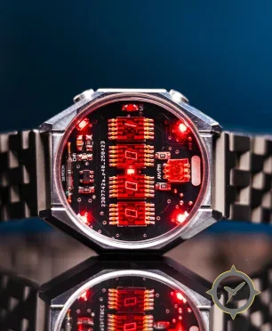 A Skeleton watch with a versatile 41mm case, that suits most wrists, crafted from stainless steel featuring a red dial with a unique printed circuit board with exposed components and red LED illumination finish.