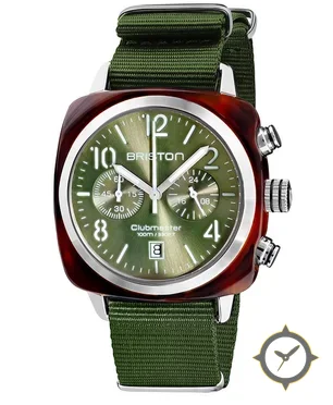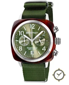 A Chronograph watch with a vintage-inspired 32mm case, crafted from resin featuring a green dial with a unique sunburst finish.