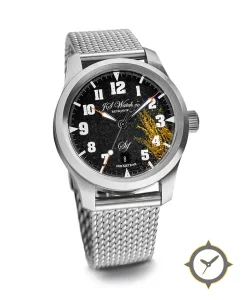 A Dive watch with a bold 43mm presence on the wrist, crafted from stainless steel featuring a black dial with a unique matte textured / stone-like finish finish.