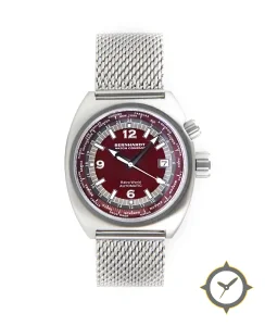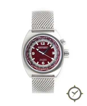 A World Timer watch with a bold 45.5mm presence on the wrist, crafted from stainless steel featuring a red dial with a unique lacquer finish, perfect for the global traveler with its world-time function.