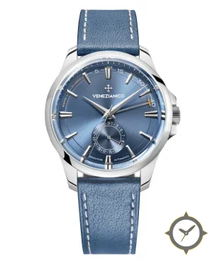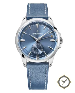 A Dress watch with a vintage-inspired 36mm case, crafted from stainless steel featuring a blue dial with a unique sunburst finish and a helpful power reserve indicator.