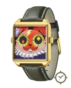 A Luxury watch with a vintage-inspired 34.5mm case, crafted from gold featuring a red dial with a unique embossed finish.