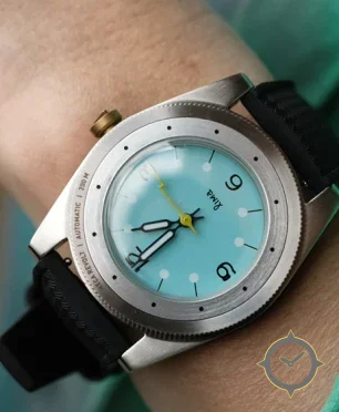 A Dive watch with a bold 42mm presence on the wrist, crafted from stainless steel featuring a turquoise dial with a unique glossy lacquer finish.