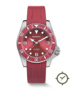 A Dive watch with a vintage-inspired 35mm case, crafted from stainless steel featuring a red dial with a unique sunburst finish.