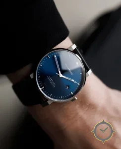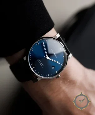 A Minimalist watch with a vintage-inspired 36mm case, crafted from stainless steel featuring a blue dial with a unique sunburst gradient finish.