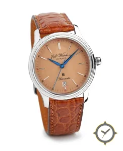 A Dress watch with a vintage-inspired 34.5mm case, crafted from stainless steel featuring a gold dial with a unique matte metallic finish.
