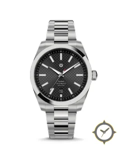 A Sports watch with a vintage-inspired 33.5mm case, crafted from stainless steel featuring a gray dial with a unique waffle / crosshatch finish.