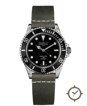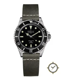 A Dive watch with a vintage-inspired 36mm case, crafted from stainless steel featuring a black dial with a unique glossy finish.