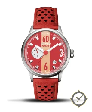 A Racing watch with a vintage-inspired 36.5mm case, crafted from stainless steel featuring a red dial with a unique matte finish.
