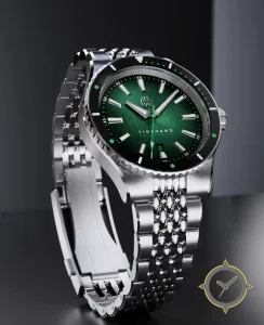 A Dive watch with a versatile 38.5mm case, that suits most wrists, crafted from stainless steel featuring a green dial with a unique sunburst finish.