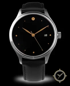 A Minimalist watch with a bold 47mm presence on the wrist, crafted from stainless steel featuring a black dial with a unique glossy lacquer finish.