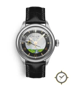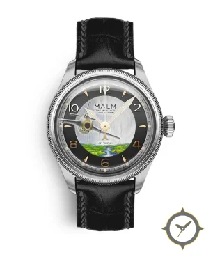 A Aviation watch with a bold 45.5mm presence on the wrist, crafted from stainless steel featuring a black dial with a unique brushed central disk with painted miniature scene finish.
