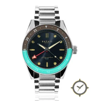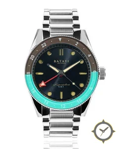 A GMT watch with a vintage-inspired 36mm case, crafted from stainless steel featuring a black dial with a unique sunburst lacquer finish and a true GMT complication for tracking a second time zone.