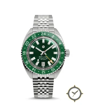A GMT watch with a vintage-inspired 36.5mm case, crafted from stainless steel featuring a green dial with a unique sunburst finish and a true GMT complication for tracking a second time zone.