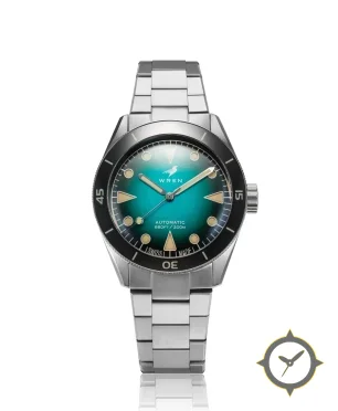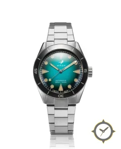 A Dive watch with a vintage-inspired 36.5mm case, crafted from stainless steel featuring a turquoise dial with a unique sunburst finish.