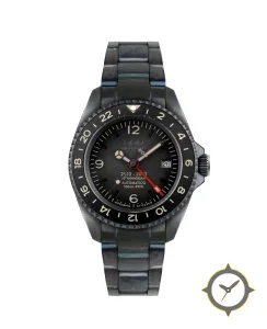 A GMT watch with a vintage-inspired 36mm case, crafted from stainless steel featuring a black dial with a unique matte finish and a true GMT complication for tracking a second time zone.