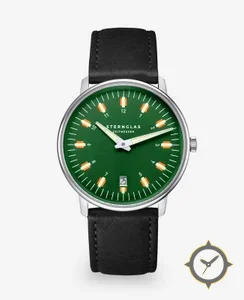 A Minimalist watch with a versatile 41mm case, that suits most wrists, crafted from stainless steel featuring a green dial with a unique sunburst/matte finish finish and a true GMT complication for tracking a second time zone.