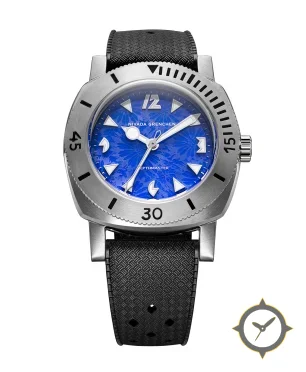 A Dive watch with a bold 46mm presence on the wrist, crafted from stainless steel featuring a blue dial with a unique textured/engraved crystalline pattern (frosted/ice-like finish) finish.