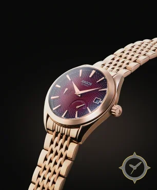 A Dress watch with a bold 45mm presence on the wrist, crafted from gold featuring a crimson dial with a unique radial guilloché (engine-turned) finish.