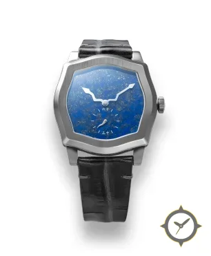 A Luxury watch with a bold 44.5mm presence on the wrist, crafted from stainless steel featuring a blue dial with a unique lapis lazuli stone with gold flecks (natural stone) finish.