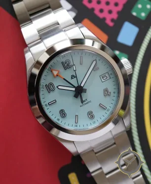 A GMT watch with a vintage-inspired 32mm case, crafted from stainless steel featuring a turquoise dial with a unique matte finish and a true GMT complication for tracking a second time zone.