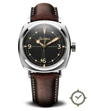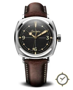 A Vintage watch with a bold 43.5mm presence on the wrist, crafted from stainless steel featuring a black dial with a unique waffle finish.