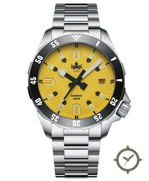 A Dive watch with a bold 45mm presence on the wrist, crafted from stainless steel featuring a yellow dial with a unique grained/textured (sandblast-style) finish.