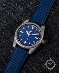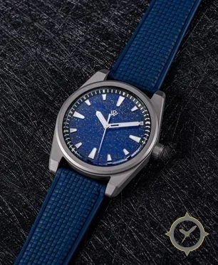 A Field watch with a vintage-inspired 36.5mm case, crafted from titanium featuring a blue dial with a unique speckled stone (lapis-like) finish.