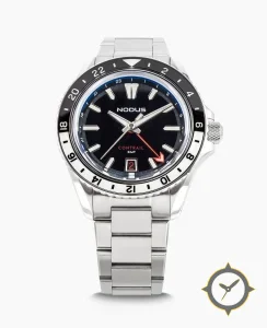 A GMT watch with a bold 45.5mm presence on the wrist, crafted from stainless steel featuring a black dial with a unique glossy finish and a true GMT complication for tracking a second time zone.