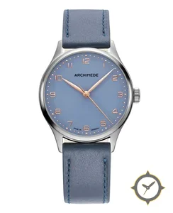 A Dress watch with a vintage-inspired 36.5mm case, crafted from stainless steel featuring a blue dial with a unique matte finish.