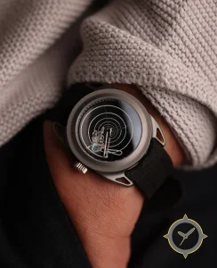 A Minimalist watch with a bold 44.5mm presence on the wrist, crafted from titanium featuring a black dial with a unique glossy finish.