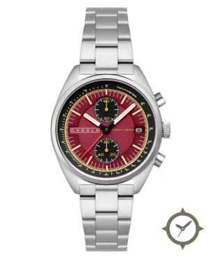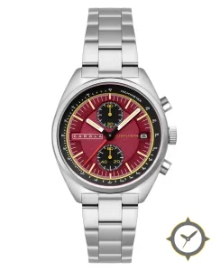 A Chronograph watch with a versatile 41mm case, that suits most wrists, crafted from stainless steel featuring a red dial with a unique textured/grain finish finish.