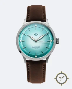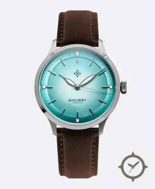 A Dress watch with a vintage-inspired 32mm case, crafted from stainless steel featuring a turquoise dial with a unique sunburst gradient finish.