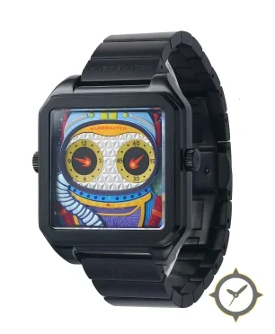 A Dress watch with a vintage-inspired 35mm case, crafted from stainless steel featuring a white dial with a unique geometric 3D triangular guilloché with printed multicolor illustration finish.