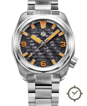 A Sports watch with a bold 43mm presence on the wrist, crafted from stainless steel featuring a black dial with a unique hammered/textured finish finish.