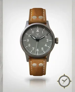 A Pilot watch with a vintage-inspired 35.5mm case, crafted from stainless steel featuring a gray dial with a unique matte finish.