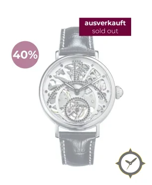A Skeleton watch with a bold 47.5mm presence on the wrist, crafted from stainless steel featuring a silver dial with a unique skeletonized / open-work finish.
