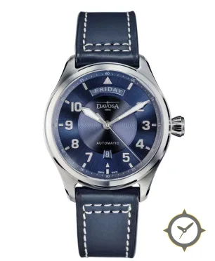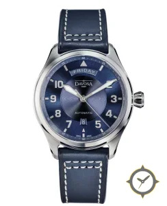 A Pilot watch with a bold 46.5mm presence on the wrist, crafted from stainless steel featuring a blue dial with a unique sunburst finish.