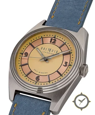 A Vintage watch with a vintage-inspired 32.5mm case, crafted from stainless steel featuring a yellow dial with a unique matte center with brushed sunburst copper chapter ring finish.