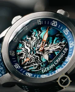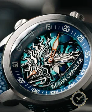 A Dive watch with a versatile 38.5mm case, that suits most wrists, crafted from stainless steel featuring a turquoise dial with a unique high-relief sculpted (bas-relief) with pronounced engraving and multi-level finishing finish.