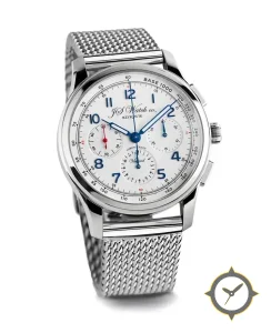 A Chronograph watch with a bold 44mm presence on the wrist, crafted from stainless steel featuring a white dial with a unique subtle linen / guilloché texture finish.