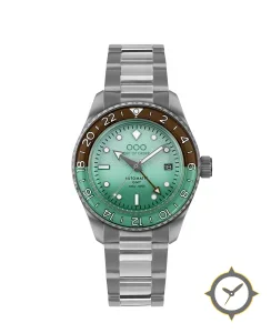 A GMT watch with a bold 43mm presence on the wrist, crafted from stainless steel featuring a turquoise dial with a unique textured granular gradient (faded/mint center) finish and a true GMT complication for tracking a second time zone.
