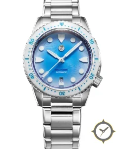 A Dive watch with a bold 42.5mm presence on the wrist, crafted from stainless steel featuring a blue dial with a unique sunburst finish.
