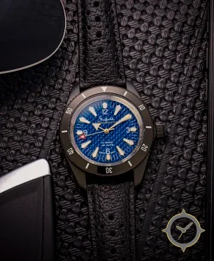 A Dive watch with a bold 46.5mm presence on the wrist, crafted from stainless steel featuring a blue dial with a unique woven / tapisserie-style textured surface finish.