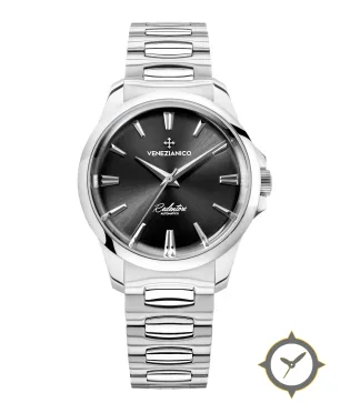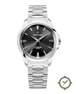 A Luxury watch with a vintage-inspired 34mm case, crafted from stainless steel featuring a gray dial with a unique sunburst finish.