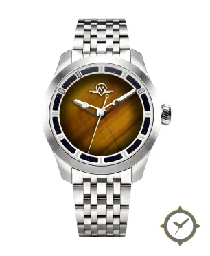 A Dress watch with a vintage-inspired 35mm case, crafted from stainless steel featuring a brown dial with a unique chatoyant gemstone (tiger's eye) finish finish.