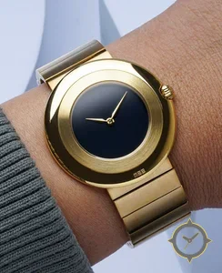 A Dress watch with a bold 45.5mm presence on the wrist, crafted from gold featuring a black dial with a unique brushed outer ring with smooth lacquered central disc finish.