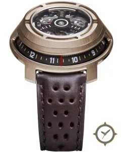 A Skeleton watch with a bold 43.5mm presence on the wrist, crafted from bronze featuring a black dial with a unique skeleton (open-work, exposed movement) finish.