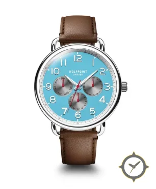 A Chronograph watch with a vintage-inspired 35mm case, crafted from stainless steel featuring a turquoise dial with a unique glossy lacquer finish.